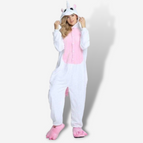 White fleece unicorn pajamas with pink accents, ideal for women.