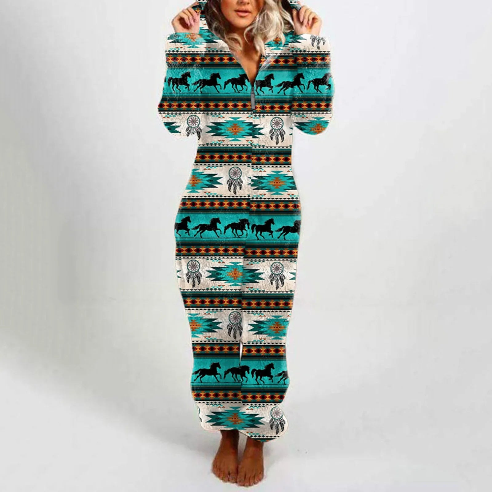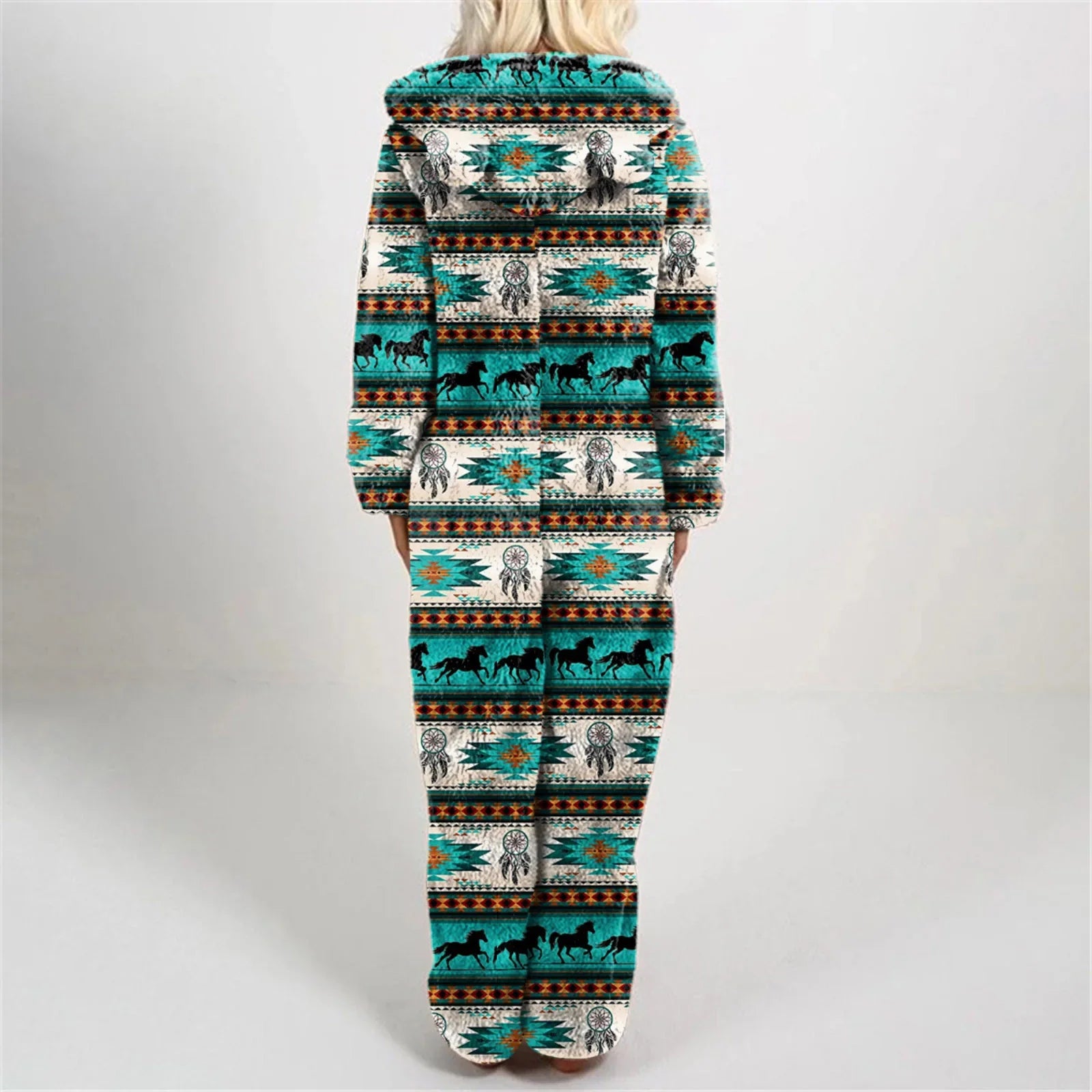 Il nostro pigiama pile donna etnico celebra l'essenza dello stile tribale attraverso un design che racconta storie ancestrali. Realizzato con pile ultra-morbido premium e decorato con autentici motivi nativi americani completo di cappuccio, questo pigiama donna stile tribale offre una vestibilità che esalta la personalità spirituale della donna moderna.